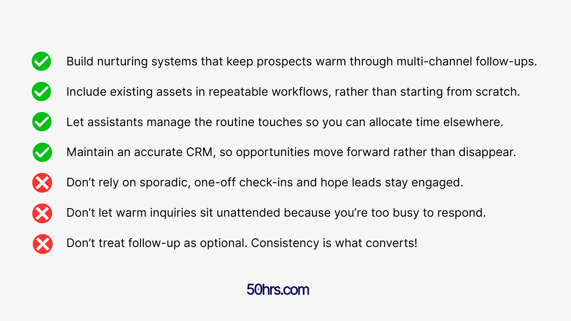 Once your assistant understands your offer, they can establish a simple weekly rhythm to keep every lead moving forward.